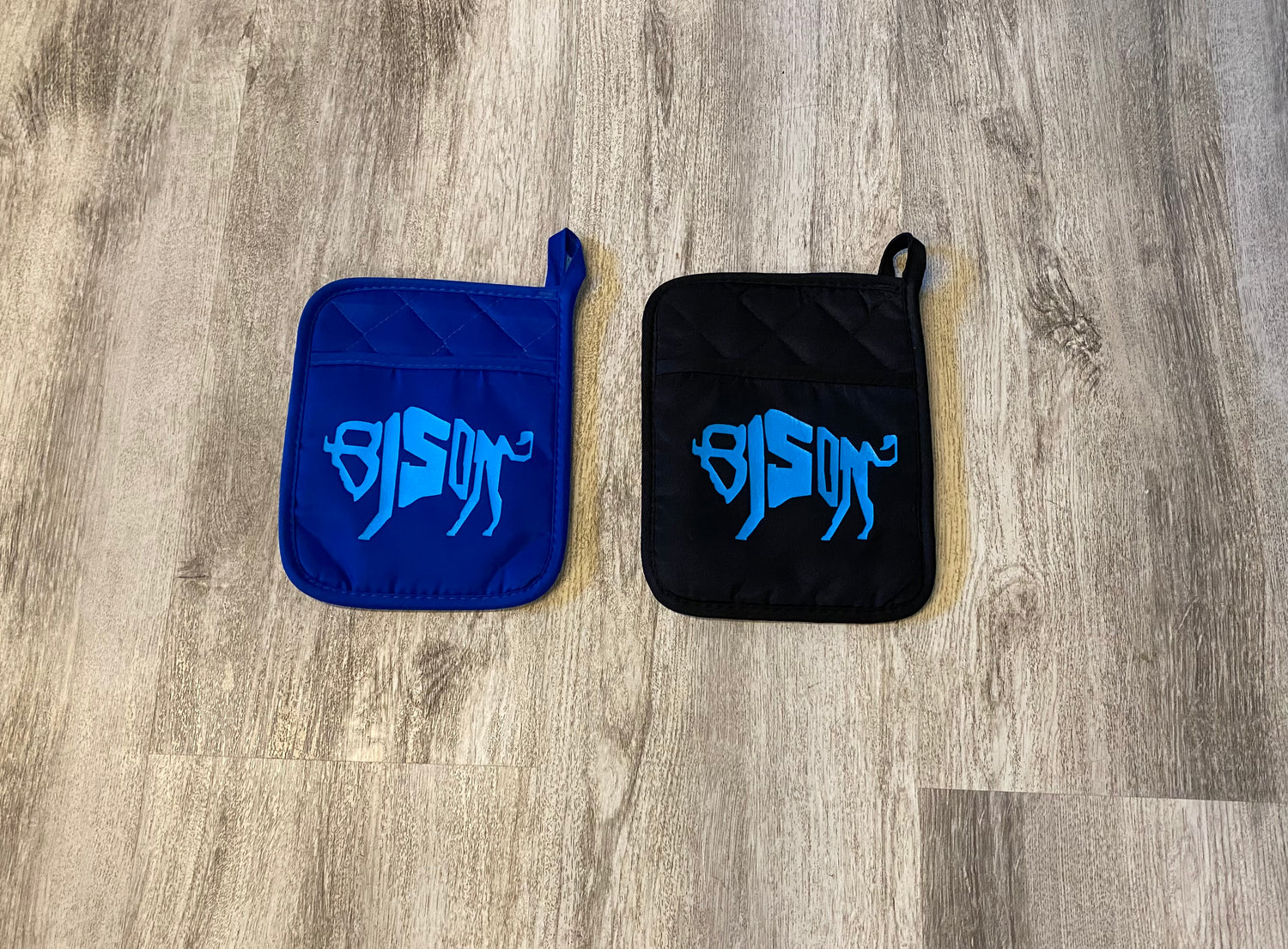 9” x 7” royal blue or black pot holder oven mitten with pocket. Bison logo in blue on front pocket.